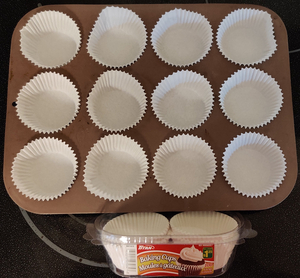First, a muffin baking tin was taken out, and each well was lined with a standard paper muffin cup: